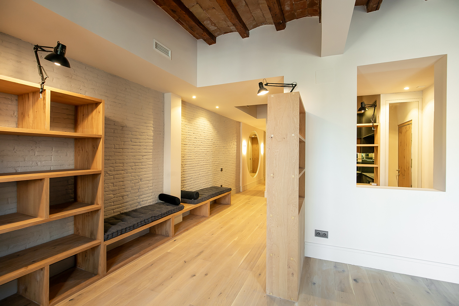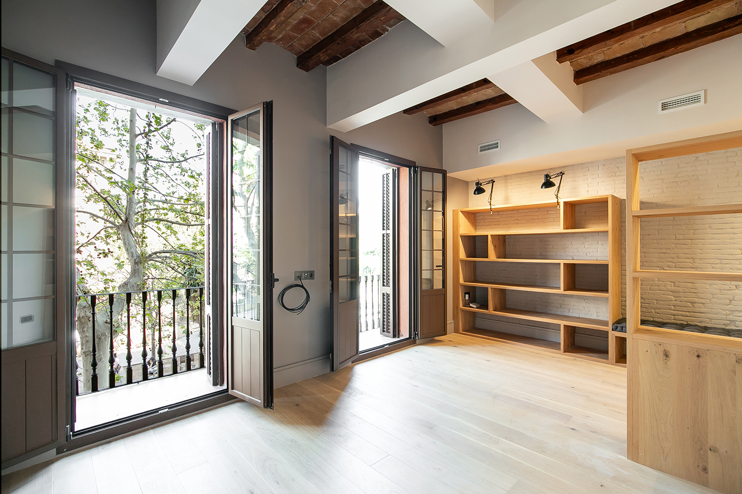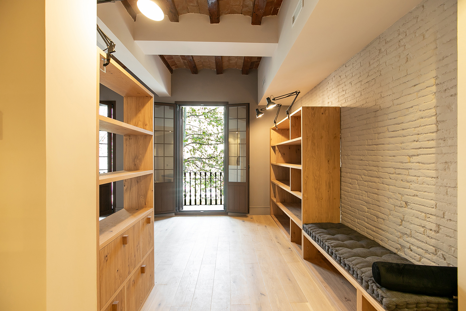 El proyecto comprende 2 viviendas en el entresuelo de la finca completamente renovadas, diseñadas con un estilo moderno, iluminación natural y balcones que dan a la calle peatonal. Cada unidad se distribuye en un living comedor con balcones y cocina abierta, una habitación en suite, una habitación doble, un baño completo y un espacio de trabajo. Todas las habitaciones poseen ventanas, lo que aporta ventilación y luminosidad tanto a la zona de noche como de día.
