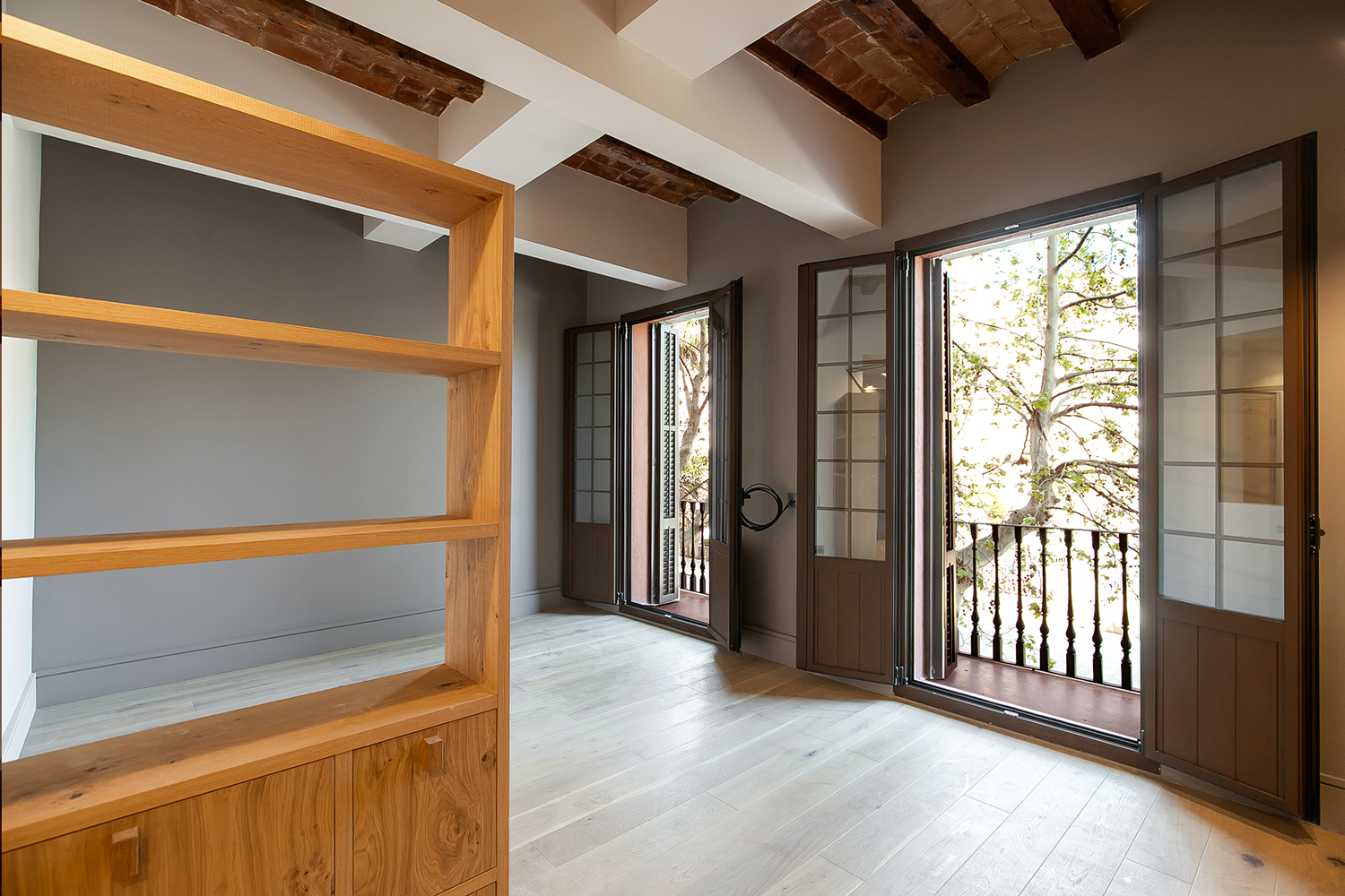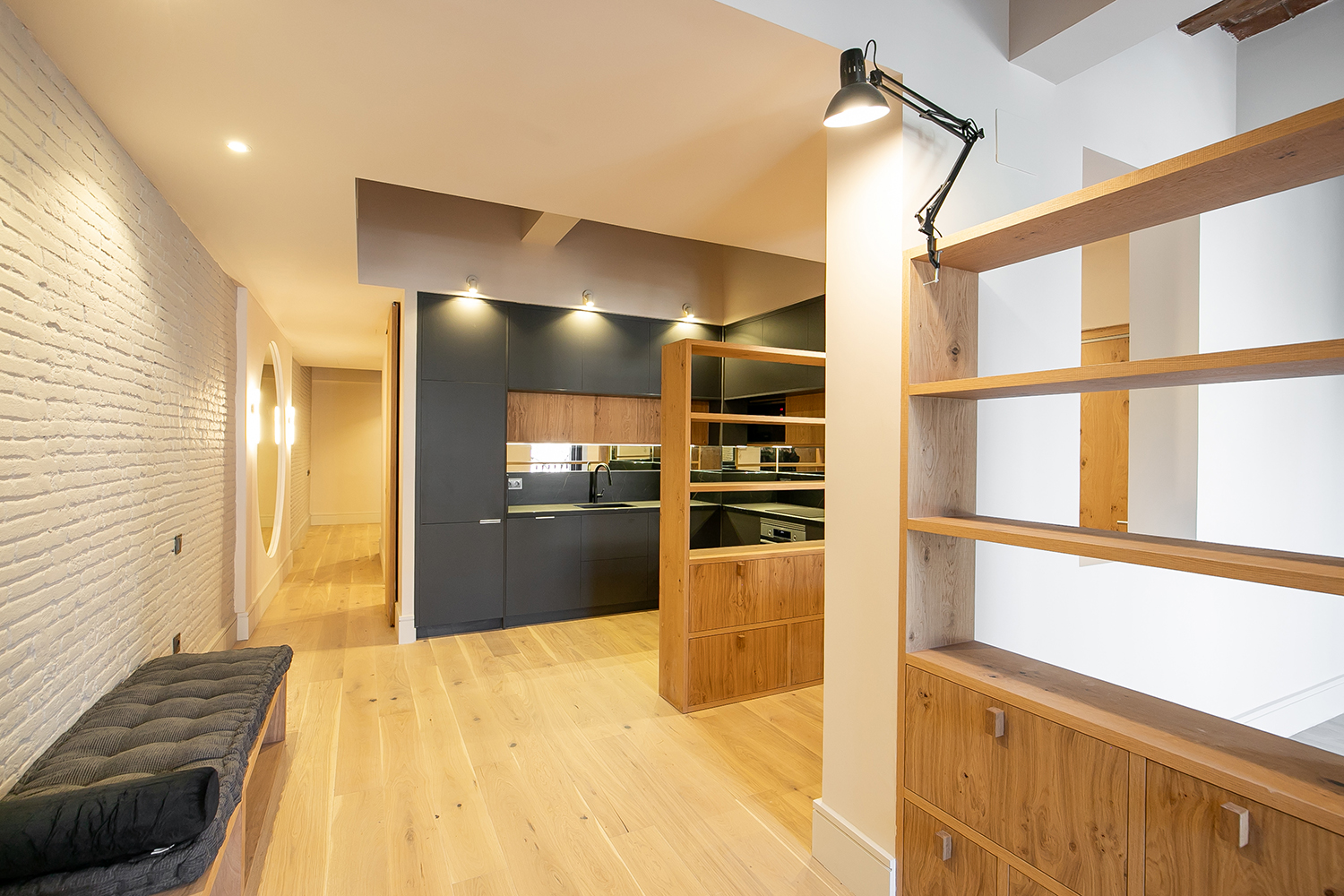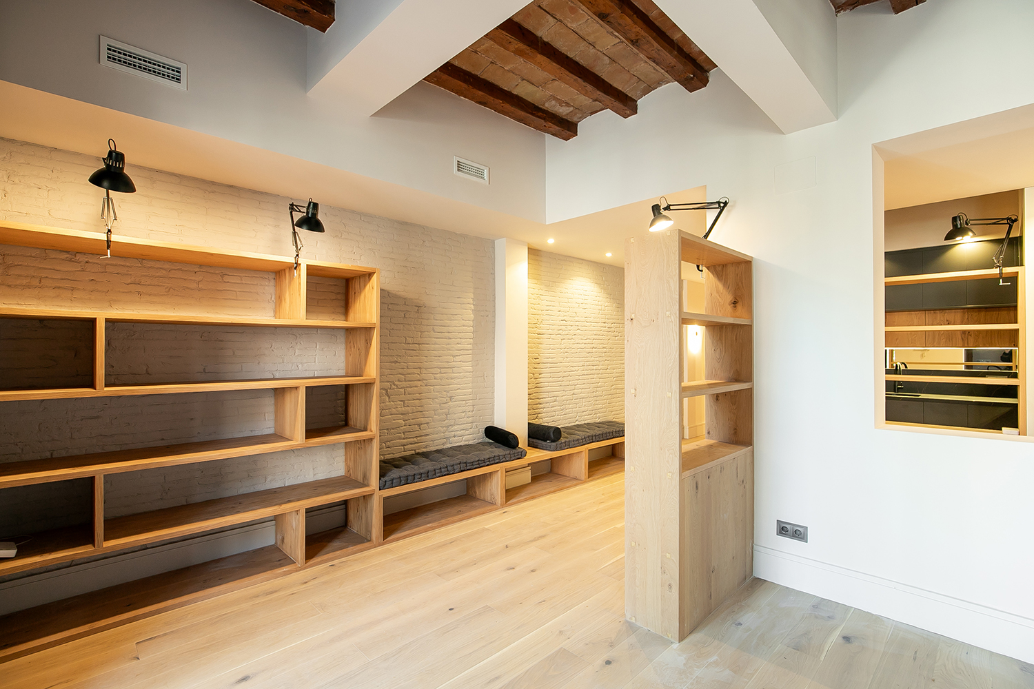 El proyecto comprende 2 viviendas en el entresuelo de la finca completamente renovadas, diseñadas con un estilo moderno, iluminación natural y balcones que dan a la calle peatonal. Cada unidad se distribuye en un living comedor con balcones y cocina abierta, una habitación en suite, una habitación doble, un baño completo y un espacio de trabajo. Todas las habitaciones poseen ventanas, lo que aporta ventilación y luminosidad tanto a la zona de noche como de día.