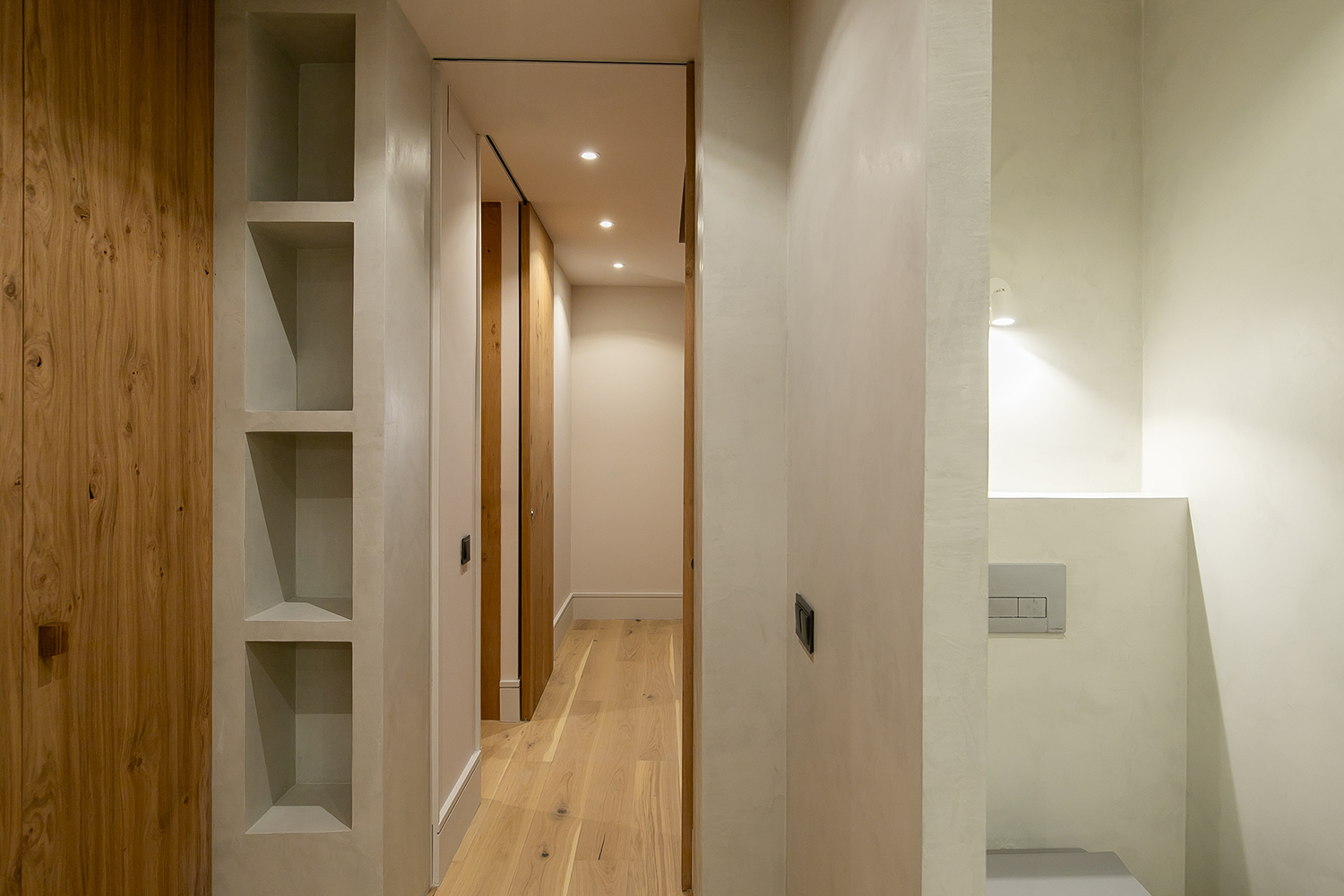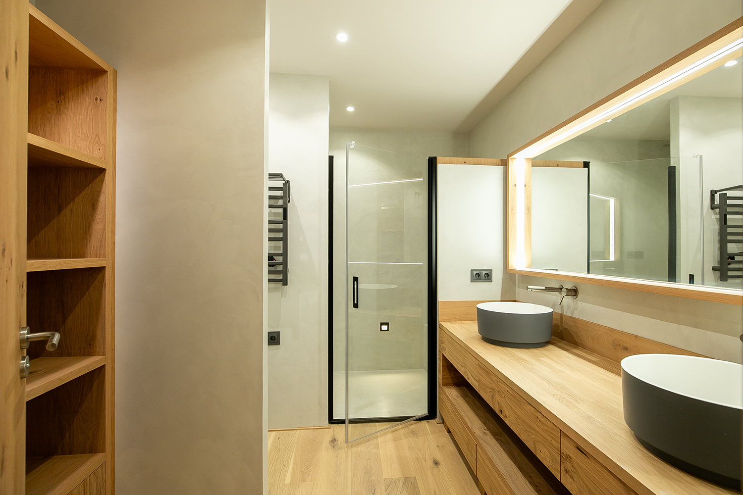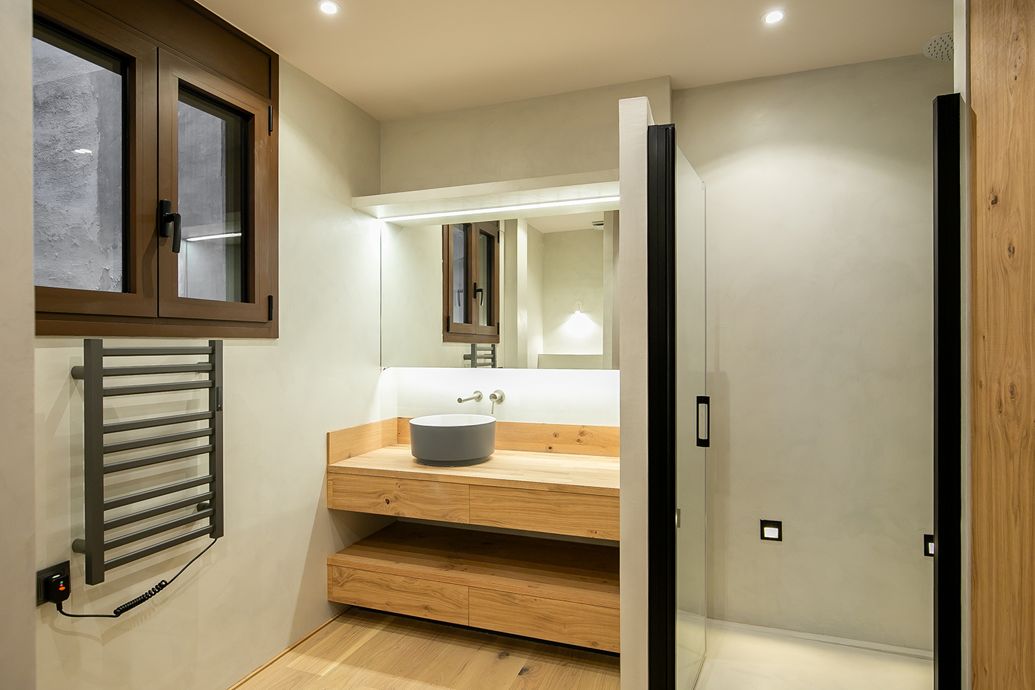 Los dos baños completos presentan un elegante acabado en microcemento, realzado por detalles en cerámica natural texturizada. La estantería y la encimera de roble, que comparten el mismo tono que el suelo, armonizan perfectamente, creando un conjunto armonioso y estético. Los platos de ducha integrados, los sanitarios suspendidos y los lavabos rectangulares sobre encimera, junto con la grifería empotrada, crean un ambiente elegante y sobrio.