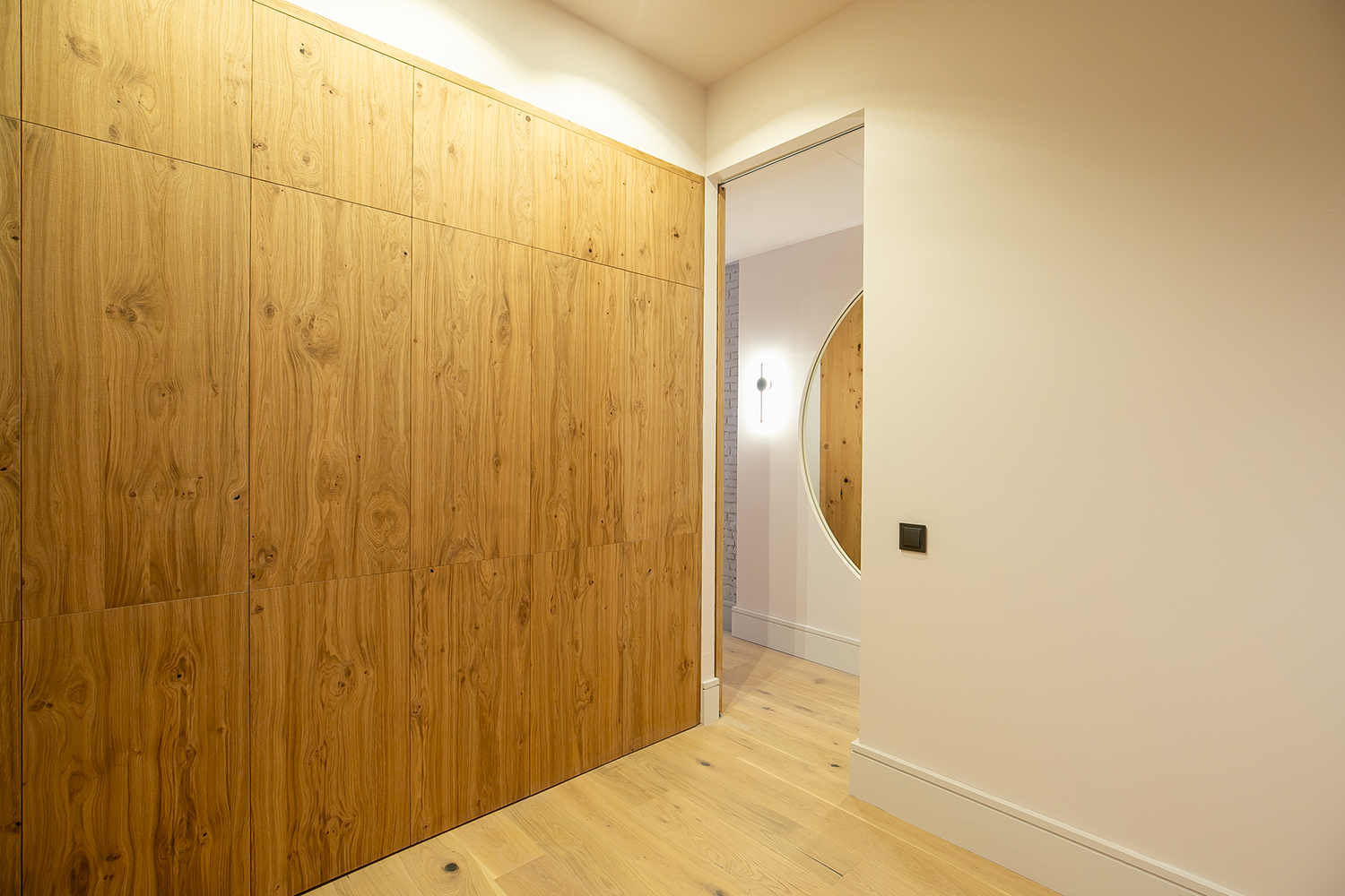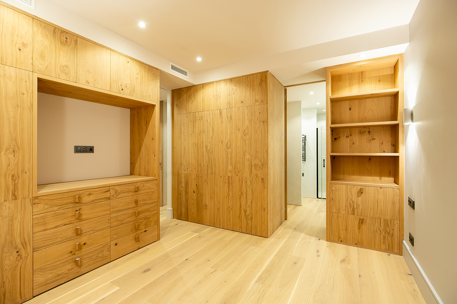 Las terminaciones de las viviendas son de alta calidad y están meticulosamente realizadas. Los armarios y estanterías de suelo a techo, con acabado en melamina de roble, armonizan con el suelo de parquet tricapa en roble natural, proporcionando una sensación de continuidad y fluidez en todo el espacio. Las cocinas, equipadas con armarios antracita de suelo a techo, detalles en roble y encimeras de Marquina, junto con la grifería negra, crean un ambiente sofisticado y elegante.
