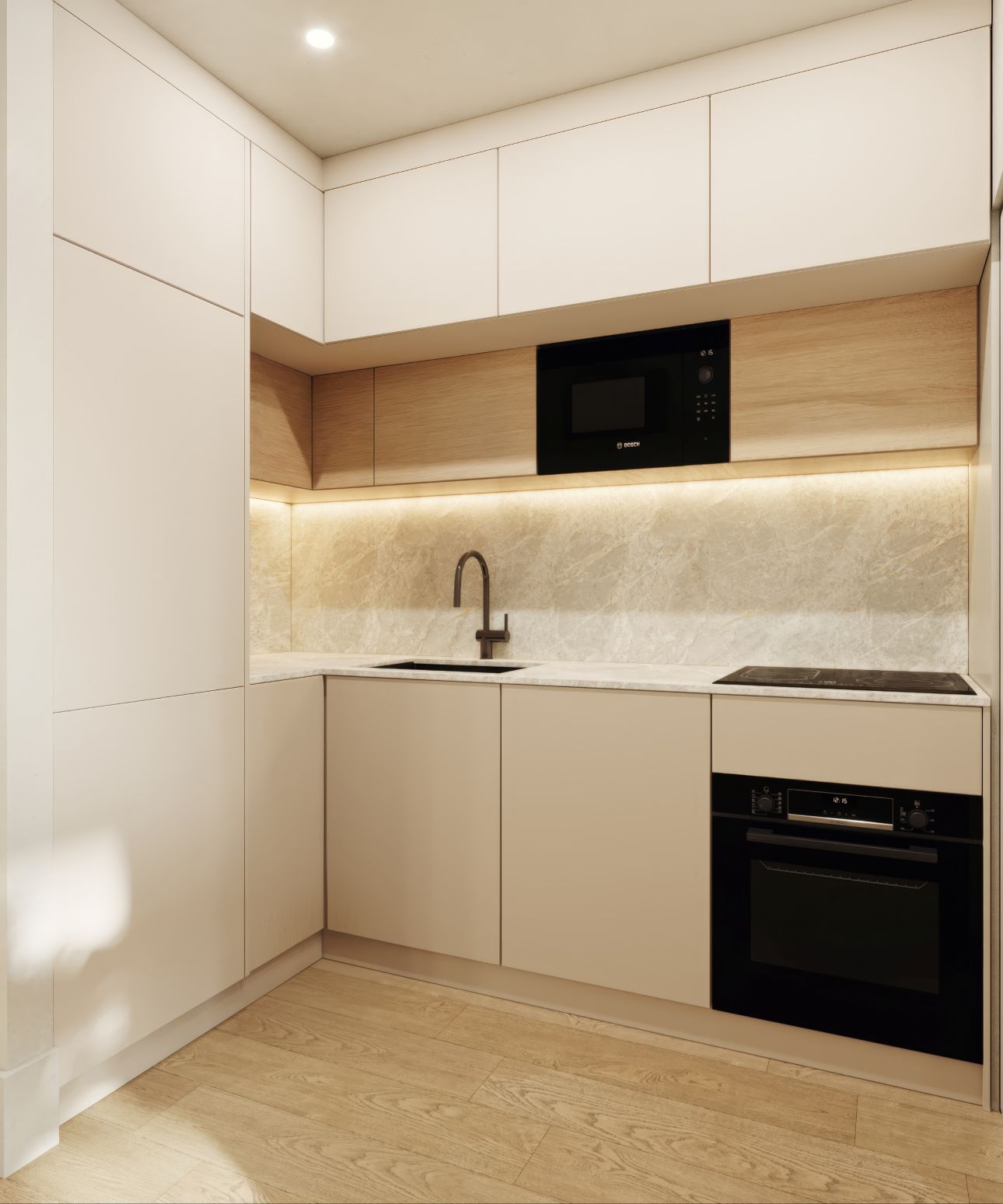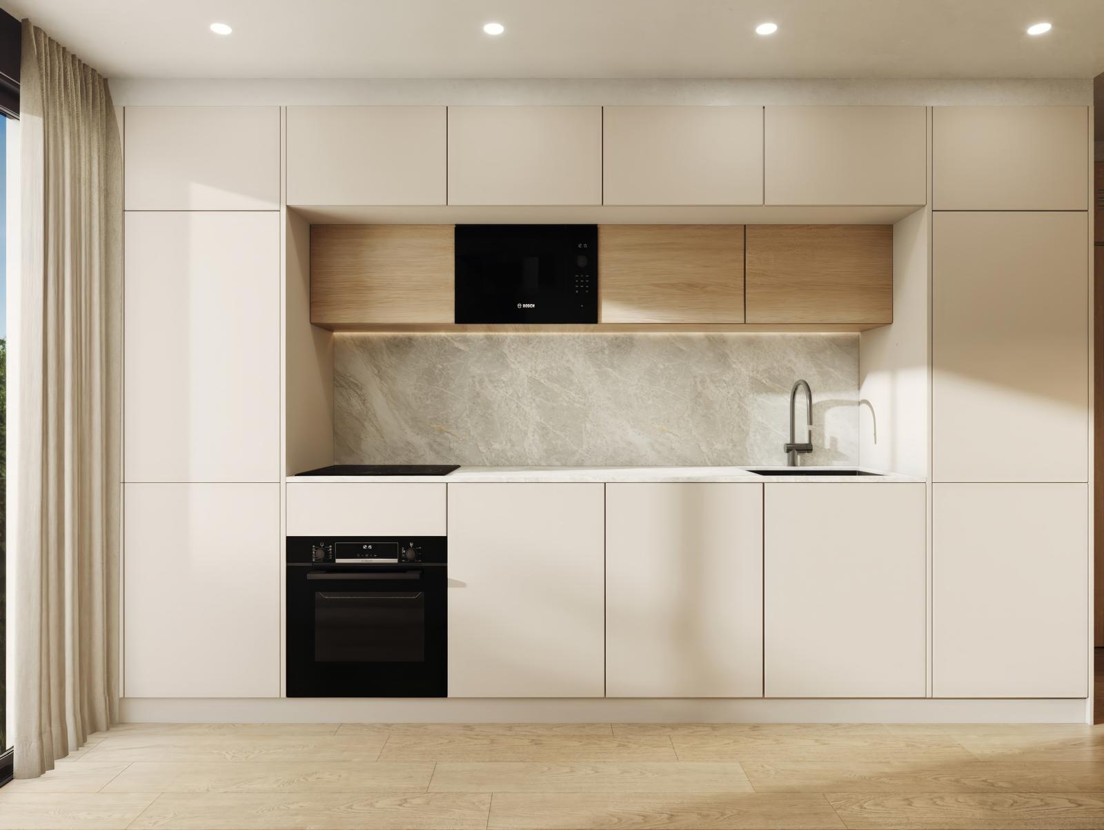 Las cocinas, de concepto abierto, combinan frentes lisos en tonos claros con detalles en madera natural y encimeras en porcelánico, ofreciendo un equilibrio perfecto entre diseño y practicidad.
