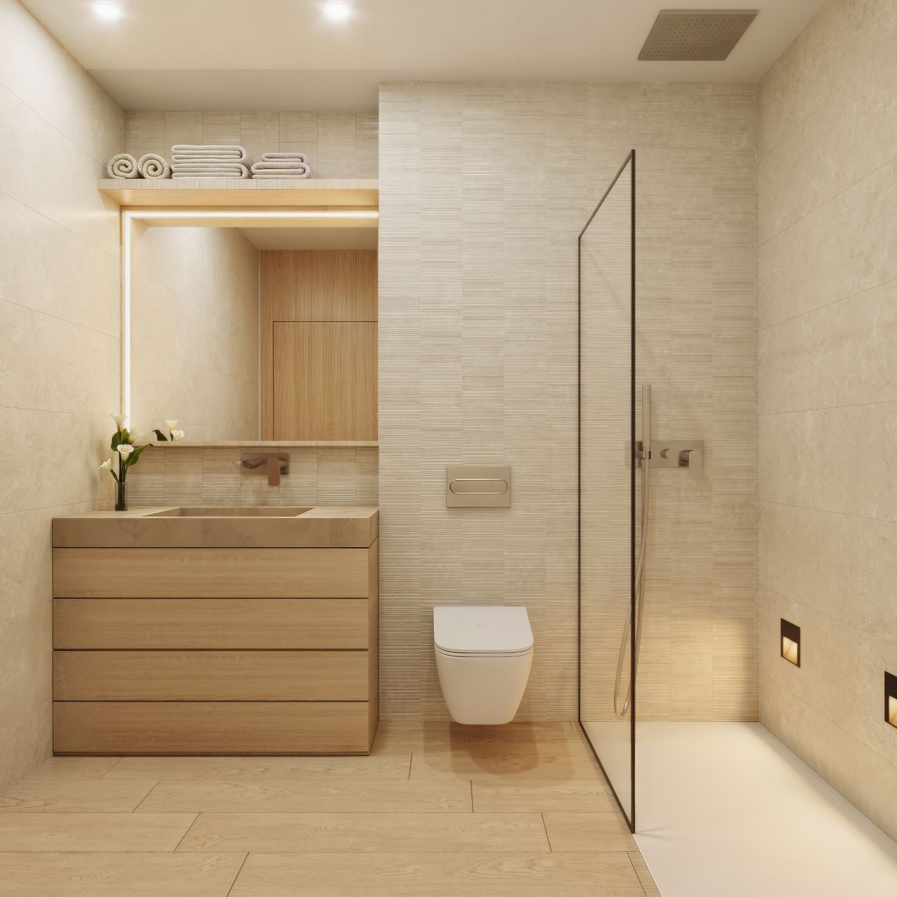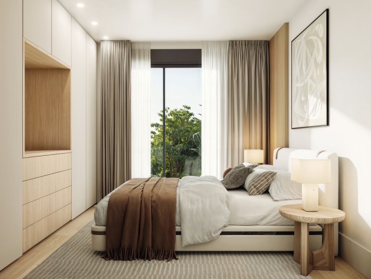 Los interiores destacan por una estética minimalista y cálida, donde la madera, los tonos neutros y la luz natural crean un ambiente acogedor y sofisticado.